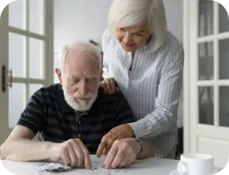 Un homme âgé avec une barbe blanche et une femme aux cheveux blancs travaillent ensemble sur un puzzle blanc. La femme pose une main encourageante sur l'épaule de l'homme, illustrant le soutien aux seniors confrontés à la maladie d'Alzheimer avec l'association Le Connétable à Dinan.
